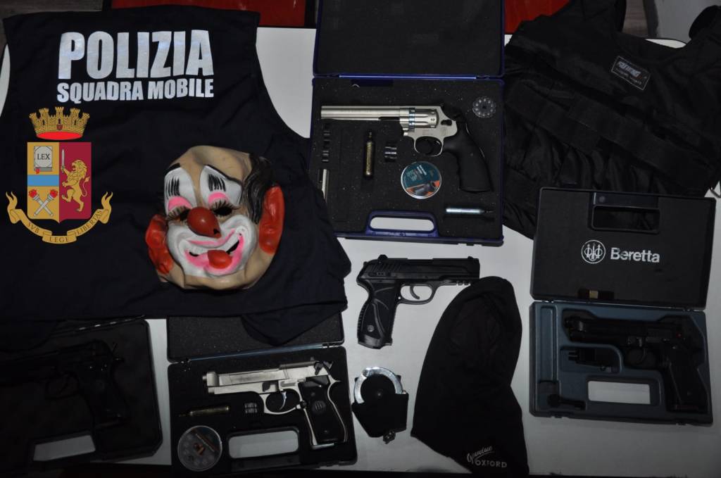 La quantità e la peculiarità del materiale rinvenuto, tra cui si segnala anche una maschera da clown, conferma come l’arrestato fosse ben inserito in collaudati circuiti criminali, al vaglio degli investigatori, e sarà oggetto di particolari analisi tecnico – scientifiche.