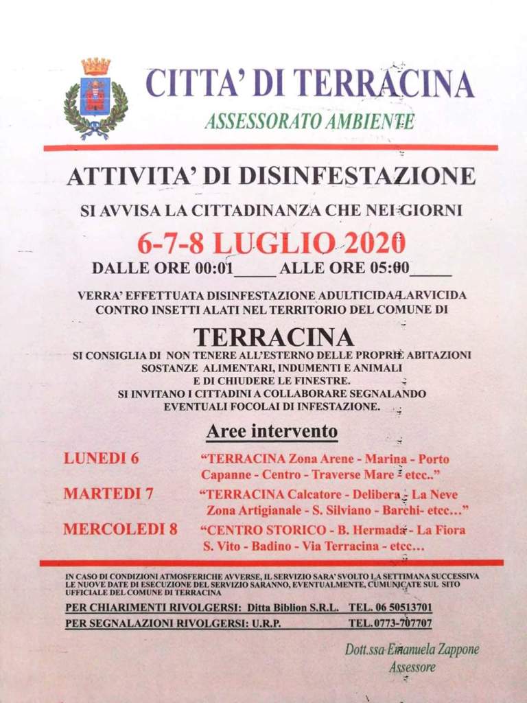 Si avvisa la cittadinanza che nei giorni 6, 7 e 8 luglio 2020, dalle ore 00:01 alle ore 05:00, verrà effettuata disinfestazione adulticida/larvicida contro insetti alati nel territorio del comune di Terracina.