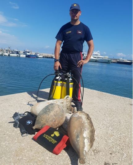 Importante recupero archeologico nelle acque di San Felice Circeo. Nei giorni scorsi, nelle acque antistanti il porto, i carabinieri del nucleo subacquei di Roma, in ossequio a quanto disposto dalla Soprintendenza Archeologica delle Belle Arti e Paesaggio per le province di Frosinone, Latina e Rieti, unitamente ad un funzionario archeologico, hanno ritrovato, ad una profondità di sei metri, tre anfore di epoca romana (la prima di lunghezza 79 cm – circonferenza 90 cm; la seconda di lunghezza 56 cm – circonferenza 97 cm; la terza di lunghezza 64,5 cm – circonferenza 74 cm ), mancanti del collo.