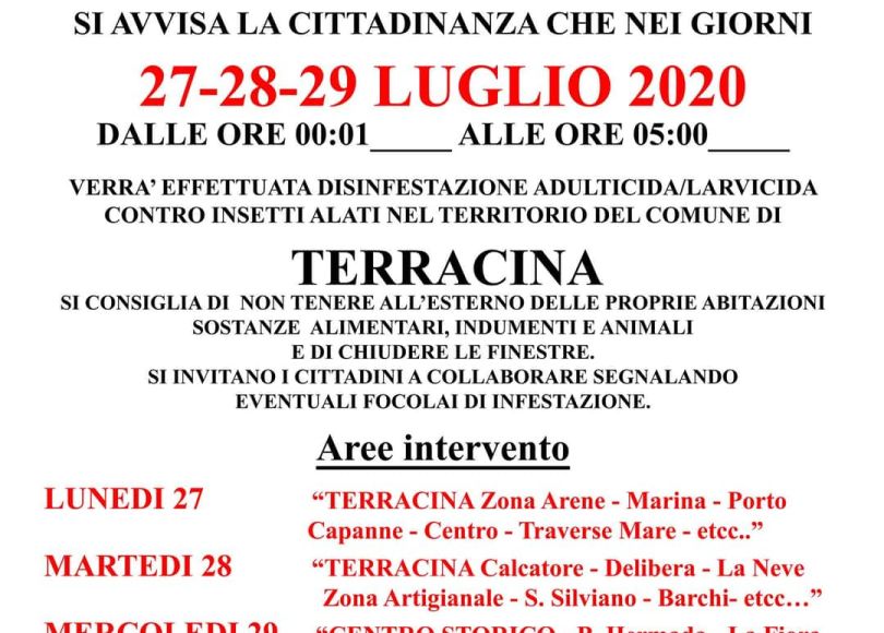 Si avvisa la cittadinanza che nei giorni 27, 28 e 29 luglio 2020, dalle ore 00:01 alle ore 05:00, verrà effettuata disinfestazione adulticida/larvicida contro insetti alati nel territorio del comune di Terracina.
