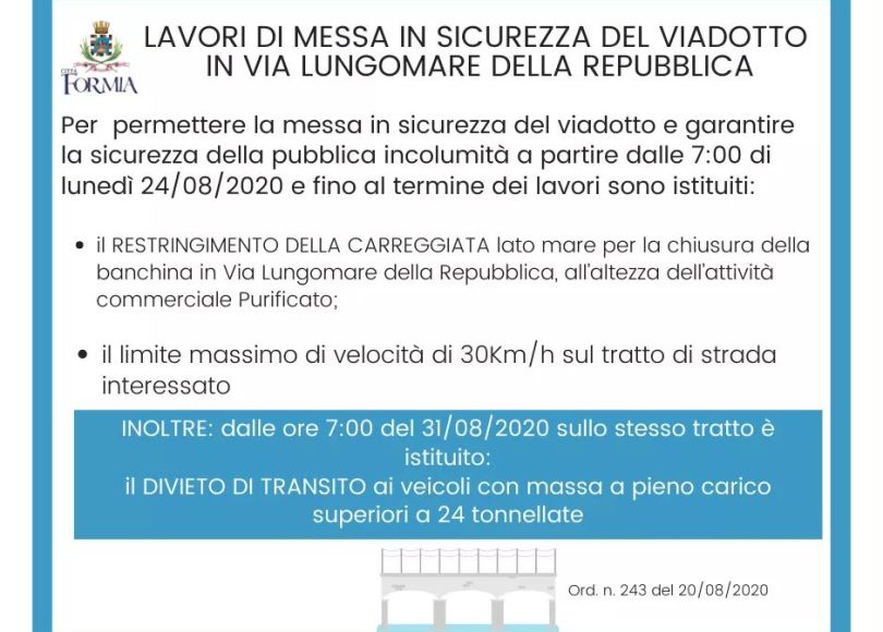 Come da ordinanza n.243 del 20 agosto 2020, per permettere la messa in sicurezza del viadotto e garantire la pubblica incolumità a partire dalle 7:00 del 24 agosto 2020 e fino al termine dei lavori sono istituiti: