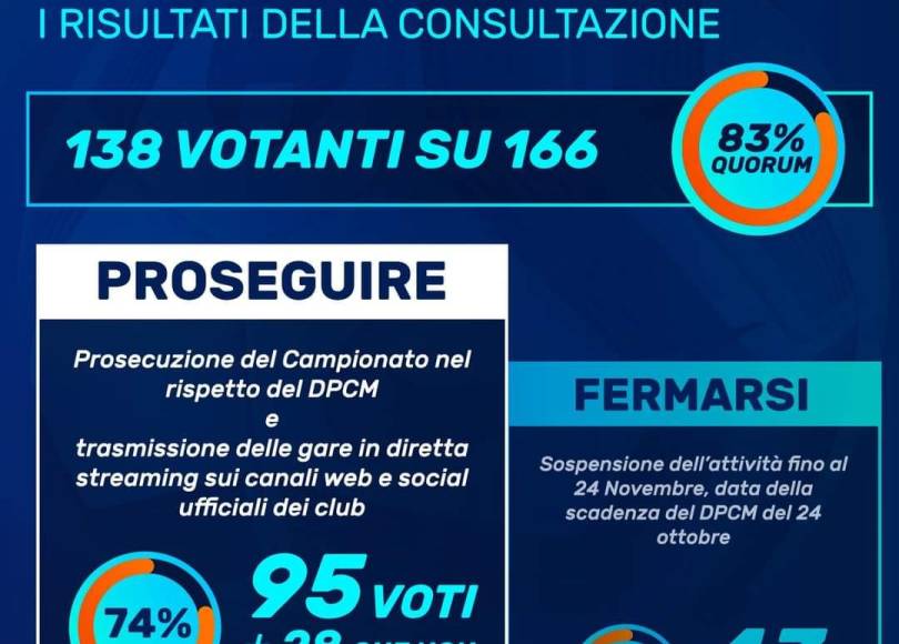 Alla fine, ha vinto la maggioranza delle società che hanno scelto di proseguire cosi come indicato anche nella serata di ieri dal Presidente Antonio Terracciano. “Abbiamo attuato fin da subito tutte le direttive anticontagio volute dalla Governo e dagli organi federali e fermarsi ora avrebbe significato gravare ulteriormente sulle società sportive già fortemente penalizzate dall’assenza del pubblico.