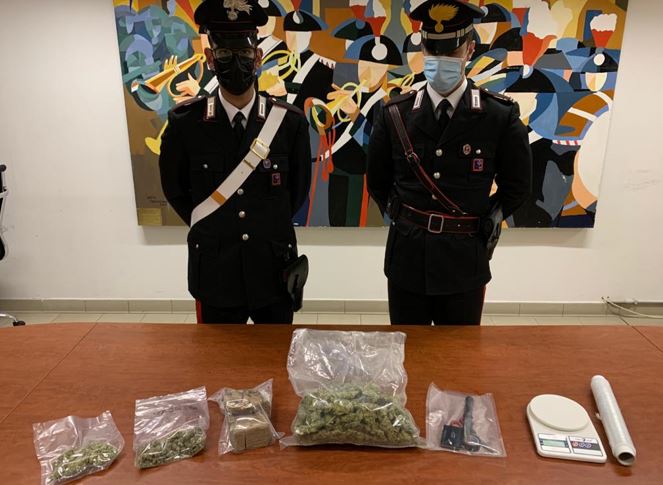 Il giovane, incensurato, nel corso di una perquisizione è stato trovato in possesso di 600 grammi di marijuana, 800 grammi di hashish, di tutto il materiale per il confezionamento della droga e di due bilancini di precisione.