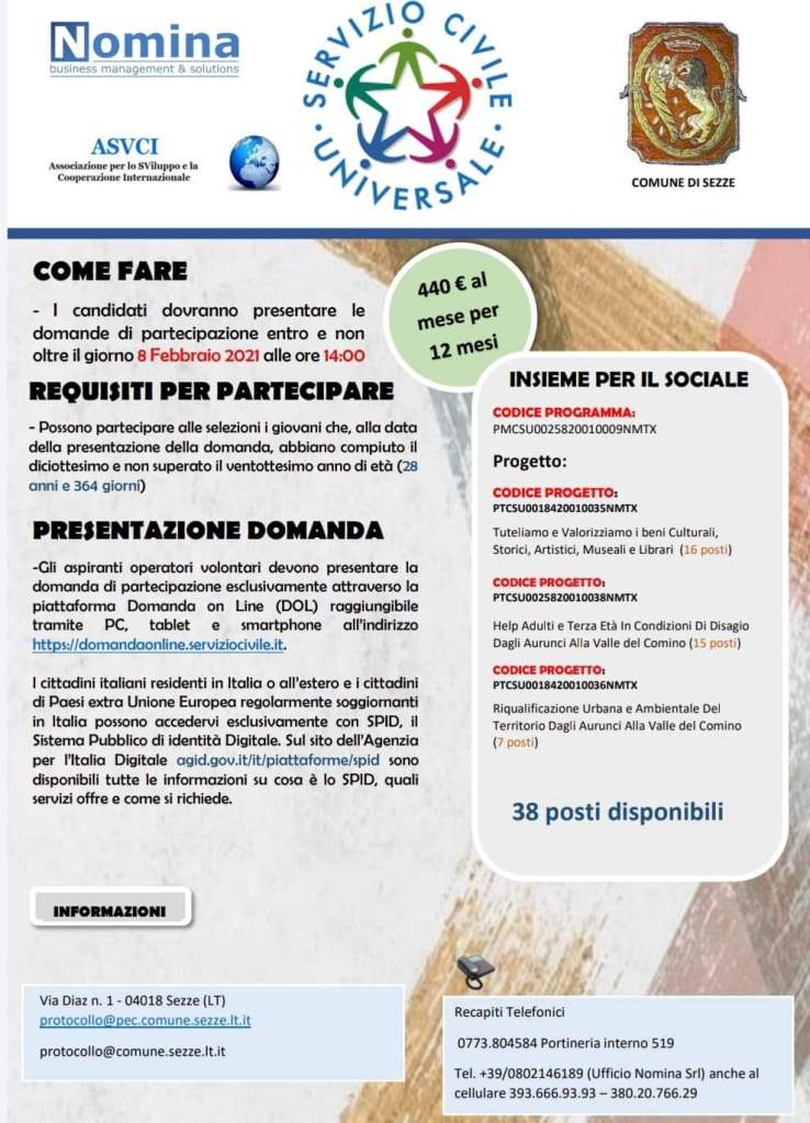 È stato pubblicato sul sito del comune di Sezze il BANDO SERVIZIO CIVILE UNIVERSALE.