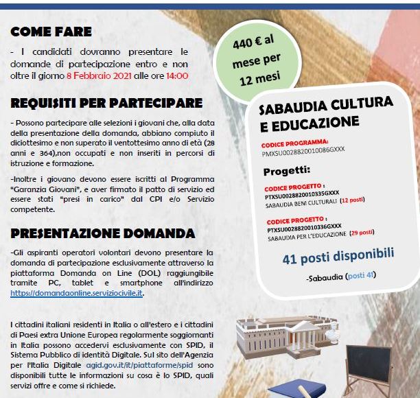 Due le progettualità, selezionate nell’ambito della più ampia pianificazione denominata “Sabaudia Cultura ed Educazione”, che offriranno l’opportunità a 41 giovani tra i 18 e i 28 anni, non occupati e non inseriti in percorsi di istruzione e formazione, di dedicarsi per un anno al servizio della comunità: 5 ore di lavoro al giorno per 5 giorni (25 ore settimanali), con un rimborso di 440 euro al mese. In particolare, i ragazzi verranno inseriti in settori che riguardano nello specifico il patrimonio storico, artistico e culturale attraverso interventi volti all’educazione e alla promozione di quest’ultimo nonché all’area paesaggistica, ambientale e del turismo sostenibile-sociale e dello sport.