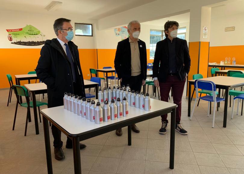 Alla presenza del Sindaco, dell’Assessore alla Pubblica Istruzione, del Dirigente del Servizio Pubblica Istruzione e del referente territoriale della Dussmann, sono state consegnate anche le borracce con il logo del Comune di Latina “Diritti a Scuola” e della società affidataria del servizio, che saranno poi regalate agli alunni che usufruiscono della mensa, il tutto per cercare di ridurre la percentuale di plastica nelle scuole, attività purtroppo rimodulata in questo particolare anno scolastico a causa della pandemia e delle linee guida ministeriali previste.