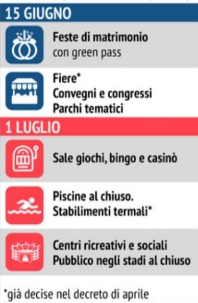 Innanzitutto il coprifuoco, che già da mercoledì 19 maggio viene posticipato di un’ora: non più alle 22, ma alle 23. Dal 7 giugno, se le cose continueranno ad andare bene, verrà spostato a mezzanotte, per essere poi abolito dal 21 giugno. In zona bianca, invece, il coprifuoco non ci sarà, e fonti di governo fanno notare come, a partire già dalle prossime settimane, gran parte dell’Italia potrà ambire a passare in fascia bianca.