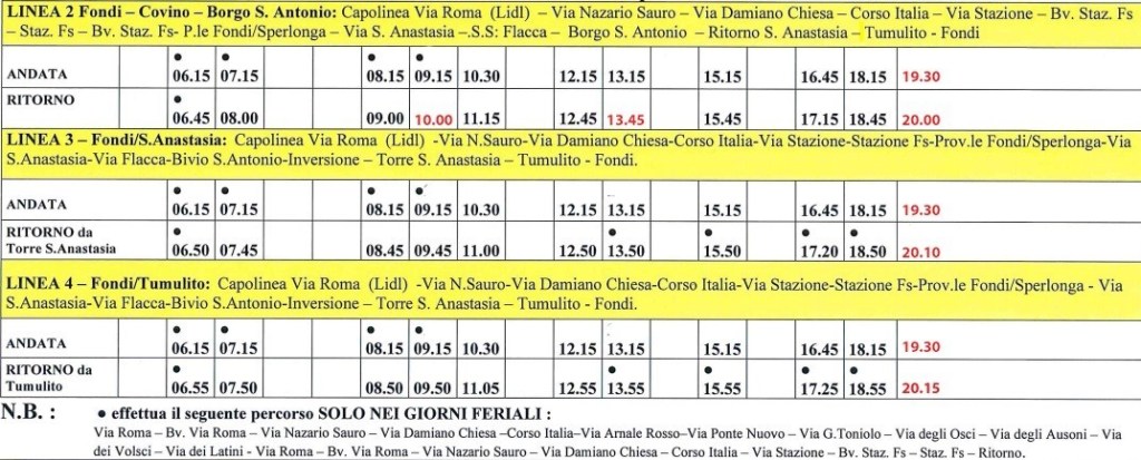 A Fondi, come richiesto dai numerosissimi utenti che utilizzano i mezzi pubblici per spostarsi dal litorale al centro cittadino, sono state implementate le corse giornaliere del servizio di trasporto urbano Piazzoli.