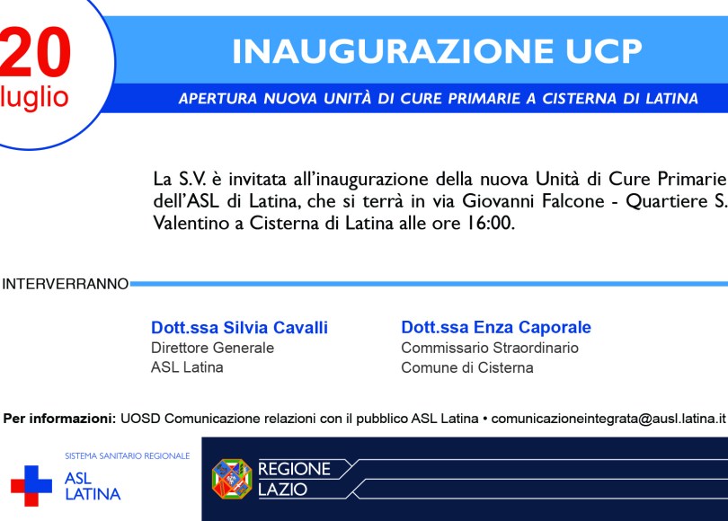 La Asl di Latina implementa il sistema di cure primarie alla cittadinanza con la nascita di un nuovo centro di Unità di Cure Primarie (UCP) – forma aggregata di equipe di medici di medicina generale – presso il popoloso quartiere S. Valentino di Cisterna di Latina. Il Centro verrà inaugurato il 20 luglio 2021 alle ore 16.00 in via Giovanni Falcone, alla presenza del Direttore Generale ASL Latina, d.ssa Silvia Cavalli, e il Commissario straordinario del Comune di Cisterna di Latina, d.ssa Enza Caporale.