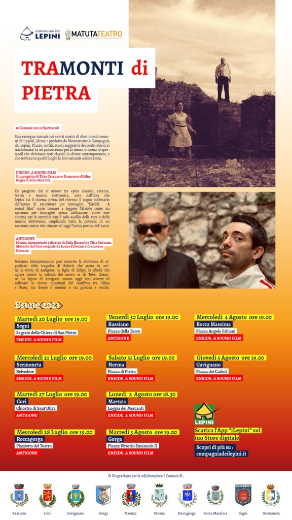 Il progetto TRAMONTI DI PIETRA, ideato e prodotto dalla Compagnia dei Lepini e dalla Matutateatro, è una rassegna teatrale che si sviluppa all’interno dei centri storici di dieci piccoli Comuni dei Lepini: “Tramonti di pietra – spiega il direttore artistico di Matutateatro, Titta Ceccano – nasce con l’intento di portare spettacoli che rivisitano i testi classici in chiave contemporanea dentro i centri storici dei Lepini, dove piazze e cortili fatti di pietra raccontano ancora antiche memorie. Scorci suggestivi si trasformeranno al tramonto in un palcoscenico naturale per la messa in scena degli spettacoli, che trovano in questi luoghi la loro naturale collocazione”.
