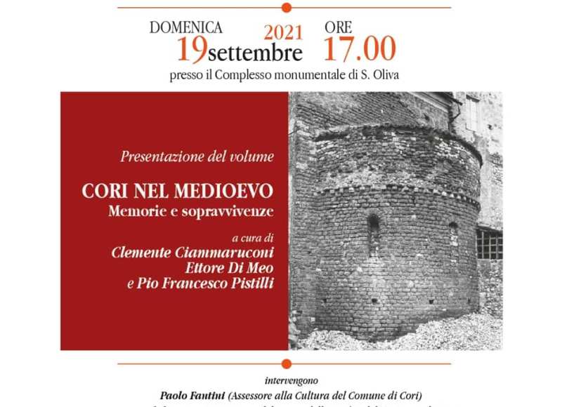 Domenica 19 settembre alle ore 17:00 la splendida cornice del chiostro di Sant’Oliva ospiterà la presentazione del libro CORI NEL MEDIOEVO. Memorie e Sopravvivenze, un lavoro prezioso curato da Clemente Ciammaruconi, Ettore Di Meo e Pio Francesco Pistilli che fa il punto sulle indagini condotte da storici, archeologi, archivisti e storici dell’arte. Si tratta del secondo dei tre incontri con l’autore programmati dall’amministrazione comunale di Cori per il mese di settembre.
