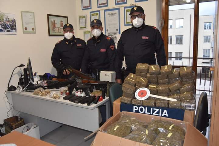 La Polizia di Stato di Latina ha arrestato sette persone trovate in possesso di droga e di un autentico arsenale. Questa notte, gli agenti della sezione criminalità organizzata della Squadra Mobile di Latina e del Commissariato di Fondi, in collaborazione con la Squadra Mobile di Frosinone e la partecipazione del Nucleo investigativo dei Carabinieri di Latina, hanno tratto in arresto 7 individui con precedenti di polizia, tutti originari delle città di Latina e Fondi, poiché colti nella flagranza del reato di detenzione di sostanza stupefacente ai fini di spaccio, di materiale esplosivo e di armi clandestine e da guerra con relative munizioni. L’operazione di polizia giudiziaria scaturisce da una attività info-investigativa, nata su impulso degli uffici della Polizia di Stato di Latina e Frosinone che ha visto la partecipazione di alcuni militari dei Carabinieri e che è stata coordinata dalla Procura della Repubblica di LatinaNello specifico, agenti e militari hanno proceduto al pedinamento di alcuni degli odierni indagati, riscontrando come questi ultimi nella mattinata di ieri si spostavano a bordo di distinte autovetture, ma in simultanea, dalla provincia di Latina verso la città di Frosinone.In quel luogo i 7 odierni indagati sono rimasti a stazionare, in una villa al centro della città, e notati nel pomeriggio, trasbordare a bordo di 4 auto e di un furgone diversi borsoni.Dopodiché quella stessa sera venivano osservati mentre si disponevano in corteo mettersi in marcia, in particolare con alcune vetture che li precedevano nella maniera tipica di chi funge da staffetta.Il personale della Polizia di Stato con l’ausilio di alcuni militari dei Carabinieri li pedinava a distanza senza mai perderli di vista.Nella citta di Fondi si decideva di procedere al fermo ed al controllo delle autovetture e dei loro occupanti.A vista era possibile rinvenire e sequestrare 60 kg di hascish e 15 di marijuana.Nel doppio fondo del furgone sono stare invece rinvenute 2 pistole, una mitraglietta e 3 fucili con centinaia di munizioni di vario calibro.Inoltre sono stati rinvenuti 15 kg di plastico, 14 detonatori e due bombe a mano.Gli ordigni sono stati disinnescati con l’intervento degli artificieri della Polizia di Stato.I prevenuti sono stati dichiarati in arresto questa notte e condotti presso il Commissariato di Fondi per l’espletamento delle formalità di rito e messi disposizione dell’Autorità Giudiziaria di Latina.