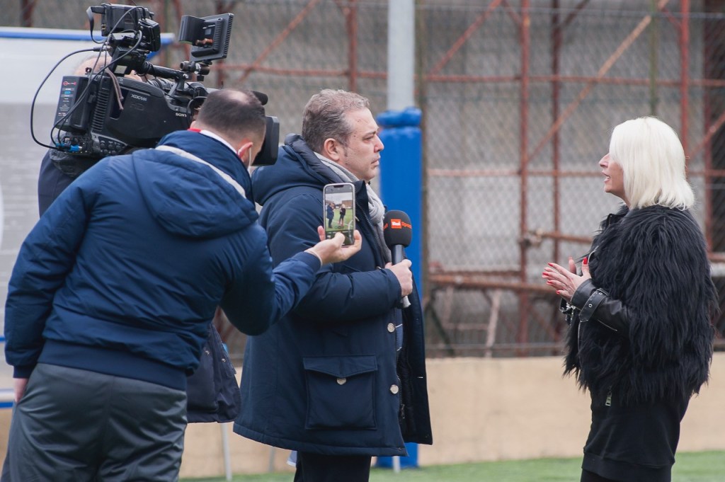 La temperatura è rigida, il cielo promette pioggia, quasi non sembra di essere a Gaeta. Sul campo della chiesa di San Paolo, però, nessuno sembra preoccuparsi del freddo, né del vento. A regalare colore, di un bell’arancio acceso, alla giornata grigia, arrivano infatti due telecamere e un microfono. Un microfono coperto da un logo: quello di RaiSport.