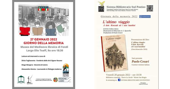 Due gli eventi in programma per commemorare le vittime dell’Olocausto. Il primo, in programma oggi, 𝐆𝐢𝐨𝐫𝐧𝐨 𝐝𝐞𝐥𝐥𝐚 𝐌𝐞𝐦𝐨𝐫𝐢𝐚, si terrà presso il Museo del Medioevo Ebraico, in Largo Elio Toaff, a partire dalle ore 18.30. Un pomeriggio per non dimenticare, promosso dall’Associazione Nazionale Partigiani d’Italia all’insegna della storia, dell’arte e della filologia. Dopo le letture a cura di Silvia Tagliavento, presidente delle Fonderie delle Arti Signor Keuner, seguiranno le dissertazioni di Diego Morgera e Alessandro Gionta, rispettivamente docente di storia e laureando in filologia moderna. Parteciperà all’evento commemorativo anche il sindaco di Fondi Beniamino Maschietto. Necessario il super green pass. Il secondo evento, dedicato alle scuole dei comuni del Sistema Bibliotecario Sud Pontino, si terrà domani, parzialmente in presenza e parzialmente in streaming allo scopo di dare la possibilità ad un maggior numero di persone di partecipare e riflettere sui temi del libro “L’ultimo viaggio – Il dottor Korczak e i suoi bambini”, di Irène Cohen-Janca con illustrazioni di Maurizio Quarello. L’evento si terrà in presenza presso la biblioteca “Dario Lo Sordo” di Monte San Biagio e potrà essere seguito in diretta anche dalla pagina Facebook del Sistema Bibliotecario del Sud Pontino. Parteciperà Paolo Cesari, traduttore e curatore della versione italiana del libro. Faranno parte del pubblico, con possibilità di intervenire, studenti di tutti i comuni del sistema tra cui le classi 5^A, 5^B, 5^C, 5^E e 4^B dell’istituto comprensivo Garibaldi di Fondi. Hanno collaborato all’organizzazione i delegati Paolo Rotunno (politiche scolastiche), Rita Di Fazio (Sistema bibliotecario e museale) ed Elena De Libero (disabilità e istruzione primaria di primo grado).«Le vittime dell’olocausto – commenta il sindaco di Fondi Beniamino Maschietto – dovrebbero essere commemorate ogni giorno dell’anno e per sempre.