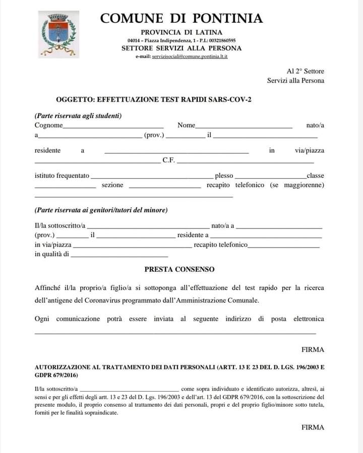 Il giorno Sabato 29, dalle ore 9 alle ore 13 e dalle ore 14 alle ore 16, il comune di Pontinia organizzerà lo screening per il personale scolastico, per gli studenti residenti a Pontinia o iscritti nelle scuole di Pontinia (0-19 anni).