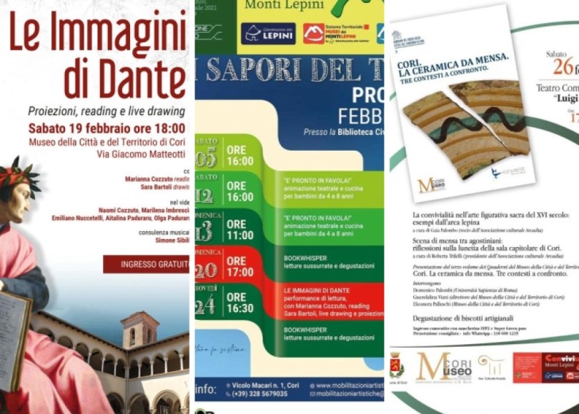 Ripartono, in piena sicurezza, le attività culturali nel Comune di Cori. Tra febbraio e marzo, diversi gli appuntamenti in programma nei vari istituti culturali della Città d’Arte, dal museo alla biblioteca al teatro comunale, ma anche nella suggestiva chiesa di Sant’Oliva. In occasione dei 700 anni dalla morte del Sommo Poeta, sabato 19 febbraio alle ore 18 nel Museo della Città e del Territorio si svolgerà l’evento gratuito ‘Le immagini di Dante’, che prevede la proiezione del video del I canto dell’Inferno, prodotto da Mobilitazioni Artistiche, realizzato nei luoghi di interesse storico artistico e naturalistico del Comune di Cori, ente promotore dell’iniziativa, oltre a una performance di lettura e di live drawing con Marianna Cozzuto e Sara Bartoli (musiche Simone Sibilia). Domenica 20 alle ore 17 nella biblioteca civica E.F.Accrocca l’iniziativa sarà riproposta nell’ambito del progetto ‘I Sapori del Teatro’. È obbligatoria la prenotazione (tel. 3285679035), per gli adulti anche il green pass. Giovedì 24 febbraio alle ore 16.30 nella biblioteca civica E.F.Accrocca prosegue il progetto ‘I Sapori del Teatro’ con BOOKWHISPER: letture sussurrate e degustazioni. Per info e prenotazioni 3285679035. Prenotazione obbligatoria e per gli adulti necessario il green pass. Sabato 26 febbraio alle ore 17 nel teatro comunale ‘Luigi Pistilli’ – nell’ambito del progetto ‘Convivium -Simposi, mense, tavole, produzioni, protagonisti, saperi, storia, arte, cultura, enogastronomia, territorio’ finanziato dalla Regione Lazio e progettato dalla Compagnia Dei Lepini in sinergia con gli istituti culturali che fanno parte del Sistema Territoriale Integrato – verrà presentato il volume ‘Cori. La ceramica da mensa. Tre contesti a confronto’ a cura di Eleonora Palleschi e Guendalina Viani. Il libro fa parte della collana ‘Quaderni del Museo della Città e del Territorio di Cori’ ed ha come oggetto la ceramica da mensa post antica rinvenuta in tre contesti della città: dopo l’importante studio di Simona Pannuzi sul materiale ceramico recuperato dall’ex convento di Sant’Oliva, si torna a parlare di ceramica medievale, rinascimentale e moderna in rapporto con l’indagine stratigrafica. Durante la presentazione del volume è previsto un approfondimento sulla convivialità nell’arte figurativa sacra dell’area lepina nel XVI secolo a cura dell’associazione culturale Arcadia. Interverranno il prof. Domenico Palombi (Università La Sapienza), Guendalina Viani (direttrice Museo della Città e del Territorio) ed Eleonora Palleschi (Museo della Città e del Territorio). L’ingresso è consentito con mascherina FFP2 e super green pass. La prenotazione è consigliata – info Whatsapp 3386001235. Sabato 5 marzo alle ore 17 nella biblioteca civica E.F.Accrocca sarà presentato il libro ‘Le Maestre dell’Arte’ di Livia Capasso. Nell’arte, come in altre professioni, le donne non riescono a emergere, non sono spesso visibili. Questa indagine sull’arte fatta dalle donne -nel libro sono presenti oltre 400 artiste a partire dalle incisioni rupestri del Paleolitico sino alle espressioni multimediali contemporanee – intende sollevare la coltre di oblio che le ha sepolte, ridare loro quella visibilità negata da pregiudizi e stereotipi, riconoscere una loro costante presenza, sottolinearne il coraggio, lo spirito di indipendenza e autonomia.Obbligatori green pass e mascherina FFP2. Domenica 20 marzo alle ore 17, l’associazione Minima presenta ‘Mistero in 4 atti’, mostra personale di Nazareno De Santis (Latina, 1987) negli spazi della Chiesa di Sant’Oliva. Il progetto, a cura di Ilaria Monti, prevede un percorso espositivo che coinvolge altri luoghi significativi del territorio: opere dell’artista saranno presenti anche presso il Museo dell’Abbazia di Valvisciolo, Palazzo Caetani a Bassiano (sede comunale) e il Museo Diocesano d’Arte Sacra di Sermoneta.