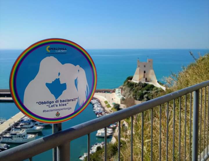 Ed eccoli i cartelli del singolare “obbligo”: una silhouette di una coppia con i visi uno accanto all’altro, su uno sfondo azzurro (come il mare di Sperlonga), il tutto integrato da un cerchio Arcobaleno, per includere tutti. I luoghi dove sono i cartelli sono in tutto 5: Belvedere Monte Circeo, Bel-vedere Grotta di Tiberio e Belvedere del Ridosso, Piazza Fontana e Torre Truglia.