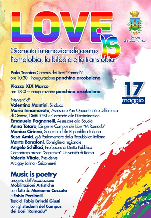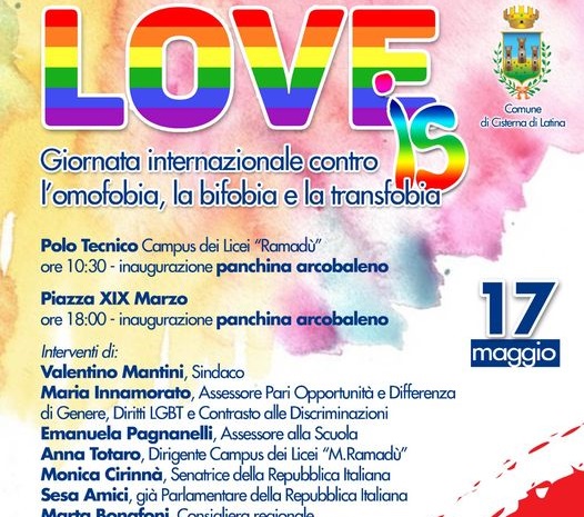 Domani, martedì 17 maggio, in occasione della Giornata internazionale contro l’omofobia, la bifobia e la transfobia, l’Amministrazione Comunale di Cisterna di Latina inaugurerà due panchine e strisce pedonali arcobaleno. Le due panchine sono state ridipinte con i colori della bandiera che simboleggia le battaglie per i diritti della comunità LGBT (sigla che significa lesbiche, gay, bisessuali e transessuali) e sono collocate una in via Einaudi, di fronte al Polo Tecnico, e l’altra in Piazza XIX Marzo, di fronte a Palazzo Caetani.