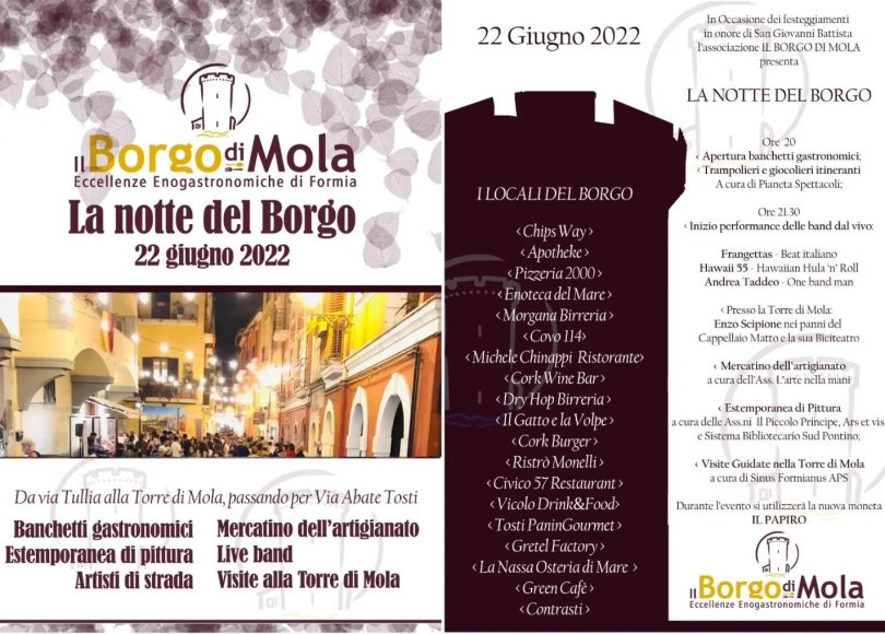Mercoledì 22 giugno, nelle centralissime Via Tullia e Via Abate Tosti c’è attesa per “La Notte del Borgo”. L’evento, organizzato dall’associazione Il Borgo di Mola, è inserito nel programma dei festeggiamenti per il patrono San Giovanni Battista.