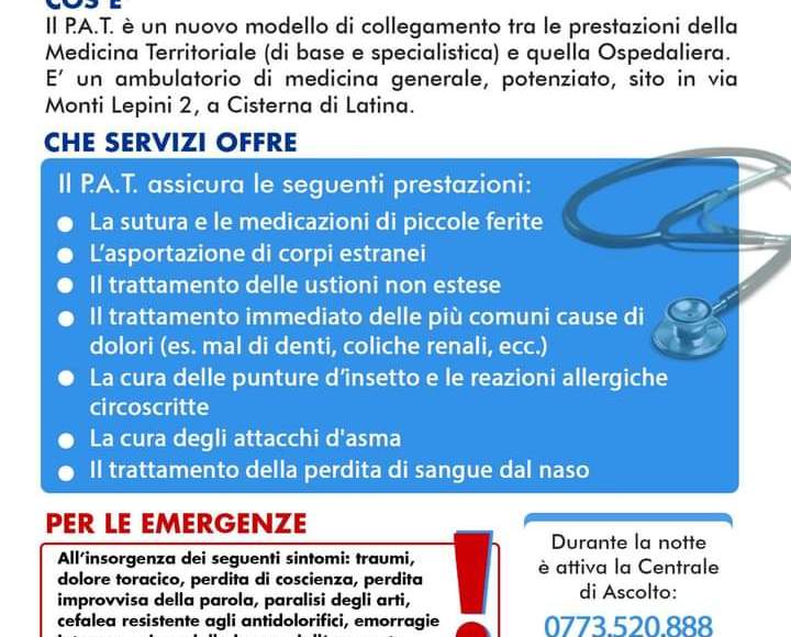 Nell’ottica di una sanità moderna e idonea a garantire risposte efficaci ai mutati bisogni di salute della popolazione legati alle mutazioni epidemiologiche e di efficientamento del sistema, e in linea alla impostazione del PNRR, la ASL di Latina, ha avviato, anche grazie a una efficace sinergia con il Comune di Cisterna, la sperimentazione di un modello innovativo che prevede nella stessa sede la presenza dei PAT e della Continuità Assistenziale, al fine di assicurare un Punto di Assistenza Territoriale ad accesso diretto alla popolazione h.24 dedicato al trattamento e alla gestione di patologie che non richiedono un trattamento d’urgenza.