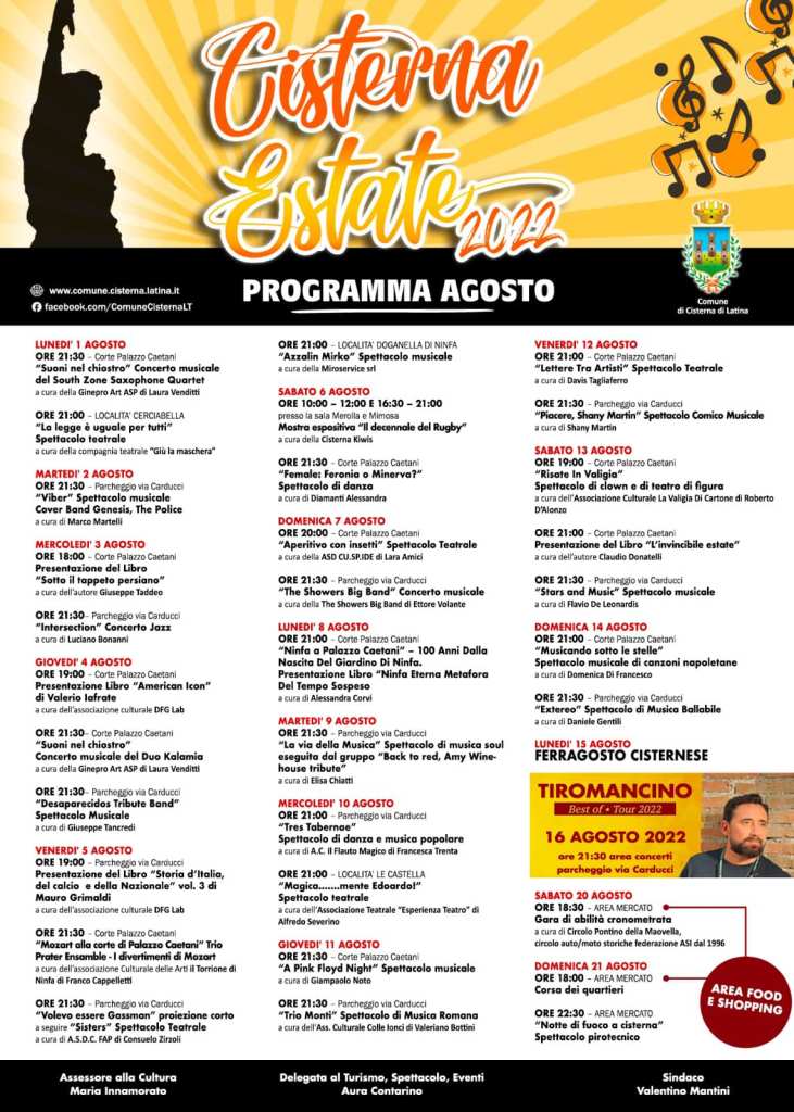 “Non smetterò mai di ringraziare tutte le persone, artisti e associazioni che si stanno adoperando per questa festa e per Cisterna – ha detto la delegata al turismo, spettacolo ed eventi Aura Contarino – Cisterna Estate è sicuramente la kermesse più impegnativa dell’anno e senza di loro non si sarebbe realizzata. Ancora grazie e buon lavoro a tutti”.