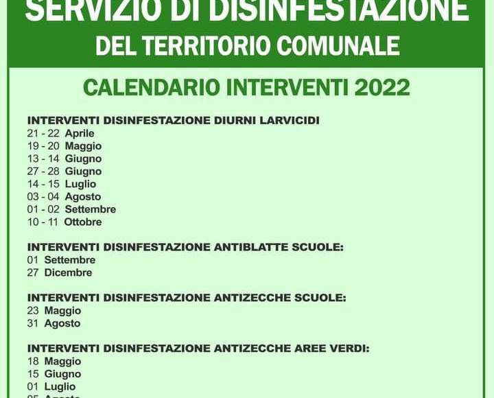 Il primo e il 2 settembre prossimi verrà eseguito l’intervento di disinfestazione diurna di larvicidi; sempre il primo settembre il servizio prevedrà una disinfestazione dalle blatte negli edifici scolastici. Il 31 agosto i plessi scolastici saranno invece interessati dalla disinfestazione dalle zecche, servizio che sarà esteso alle aree verdi, parchi e giardini comunali, il 3 settembre. Tra domani e il 5 settembre, infine, è prevista la derattizzazione e la disinfestazione delle scuole del territorio, attraverso attività di controllo e ritiro dei box che servono da esca.