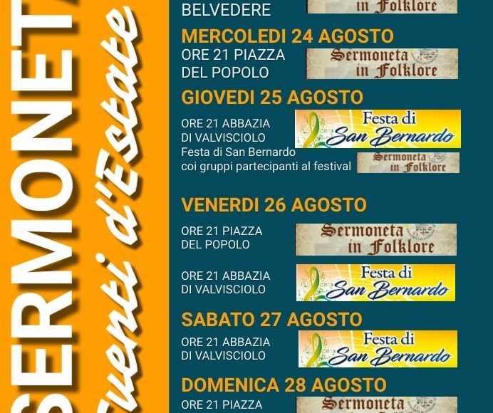 Da giovedì a domenica, inoltre, ci sarà anche la Festa di San Bernardo a Valvisciolo organizzata dall’associazione culturale Abbazia di Valvisciolo con il patrocinio del Comune di Sermoneta. Proprio giovedì la festa sarà aperta dall’esibizione dei gruppi folklorici del Sermoneta in Folklore.