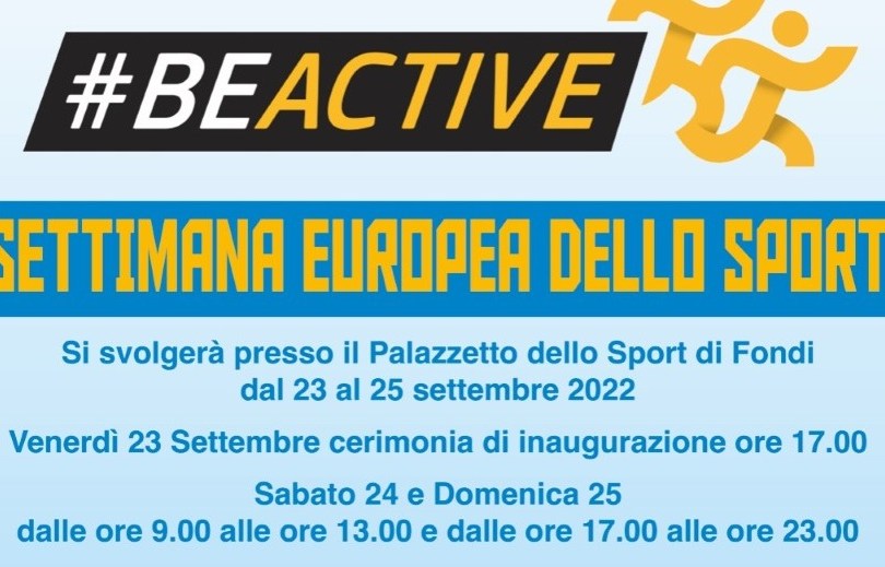 «Invitiamo la cittadinanza a partecipare numerosa agli eventi in programma questo weekend al Palazzetto dello Sport – commentano il sindaco di Fondi Beniamino Maschietto e l’assessore allo Sport Fabrizio Macaro – sia per fare sport nell’ambito delle numerose iniziative organizzate dalle associazioni ma anche ad assistere dagli spalti, a fare il tifo e a vivere, in contemporanea a migliaia di altre città europee, i valori dell’evento quest’anno denominato #beactive».