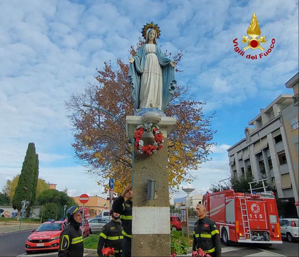 Un rito diventato ormai tradizione. Nella giornata di oggi, giorno dell’Immacolata, i vigili del fuoco del Comando Provinciale di Latina hanno deposto una doppia corona di fiori sulle statue presenti in città.