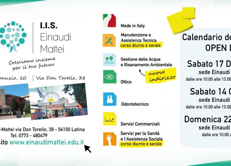 Sarà una giornata interamente dedicata a conoscere l’offerta formativa degli istituti scolastici Einaudi-Mattei di Latina quella di sabato prossimo, 17 dicembre.