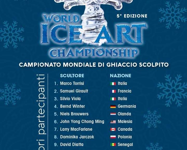Il World Ice Art Championship quest’anno vedrà la partecipazione di 13 artisti provenienti da ogni parte del mondo daranno vita a forme fantasiose realizzate col ghiaccio. Sotto l’attenta lente della giuria internazionale composta da Amelio Mazzella, Juhani Lillberg, Roberto Coccoloni, si sfideranno: dall’Italia Marzo Torrisi e Silvio Viola; dalla Francia Samuel Girault; dalla Germania Bernard Winter; dall’Olando Niels Brouwers e Thomas Weijenberg; dalla Malesia John Yong Chong Ming e Kee Gawat; dal Canada Larry MacFarlane; dalla Polonia Dominika Jarczok; dal Senegal David Diatta; dal Belgio Frank De Conynck; dal Montenegro Luka Radojevic.
