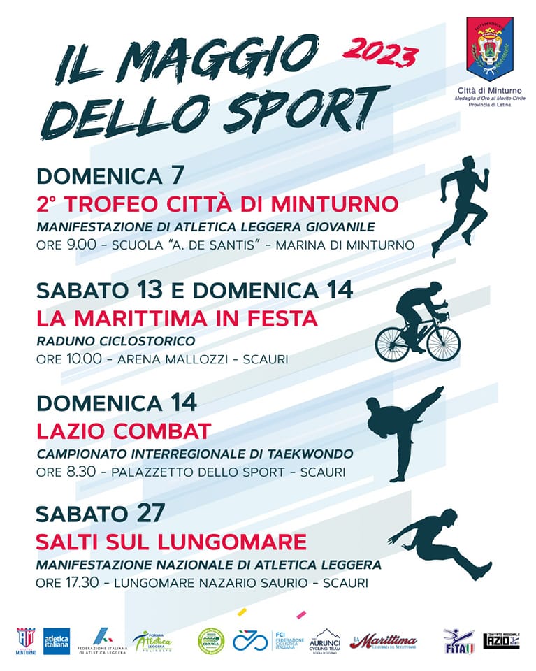 Il mese sportivo si concluderà con “Salti sul Lungomare di Scauri”, manifestazione nazionale di atletica leggera, raduno ideato dall’Atletica Minturno Asd, in programma sabato 27 maggio, alle 17,30, nei pressi della Villa comunale, in Piazza Caio Mario.
