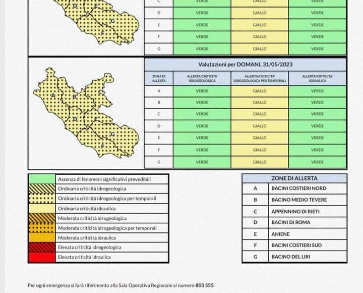 Dal pomeriggio di oggi e per le successive 6 ore e dalla tarda mattinata di domani 31 maggio e per le successive 6 – 9 ore si prevedono precipitazioni sparse, a prevalente carattere di rovescio o temporale con quantitativi cumulati da deboli a puntualmente moderati. Tenuto conto delle caratteristiche spazio – temporali delle precipitazioni previste e della loro intensità, dello stato di saturazione dei suoli e dei corsi d’acqua la protezione civile ha diramato quindi un’allerta gialla.