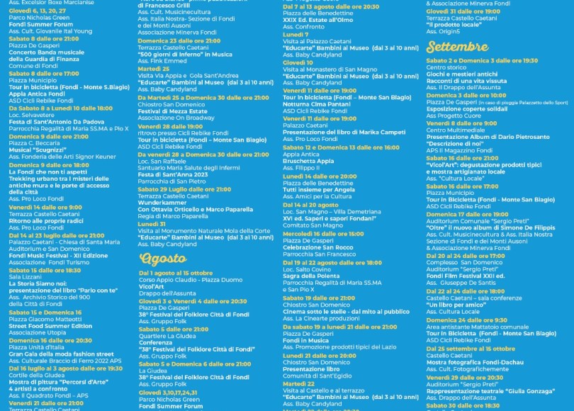 Appuntamenti all’aperto, nelle location più suggestive al cospetto della volta celeste, per godere appieno delle lunghe serate di luglio, agosto e settembre: è ufficialmente online il cartellone degli eventi estivi “Fondi sotto le stelle”. La terrazza del Castello Caetani, le piazze del centro storico, la giudea, Piazza Unità d’Italia, il complesso di San Domenico, il chiostro di San Francesco, Villa Demetriana, Piazza delle Benedettine, Piazzale delle Regioni e, naturalmente, Piazza Alcide De Gasperi: il programma del 2023 privilegia i grandi spazi “en plein air” per vivere la calda estate fondana.Tra i momenti più attesi lo spettacolo comico di Biagio Izzo il 23 agosto e il grande concerto della Banda Musicale della Guardia di Finanza diretta dal Maestro Leonardo Laserra Ingrosso l’8 luglio all’anfiteatro, l’edizione estiva dello Street Food il 15 e il 16 luglio, la Festa della Birra in Piazzale delle Regioni dal 26 agosto al 3 settembre, un concorso di bellezza il 22 agosto e persino un grande evento di moda il 16 luglio. Il corso Appio Claudio, inoltre, si tingerà dei colori dell’amore grazie a Vicol’Art che negli ultimi due anni ha portato nel centro storico una ventata di freschezza con vele e ombrelli e che quest’anno si è lasciata ispirare da Cupido.Non mancheranno, naturalmente, gli appuntamenti che fanno ormai parte della lunga tradizione estiva fondana come il Festival del Folklore (3-6 agosto), l’Estate all’Olmo (7-13 agosto), Tutti insieme per Angela (14 agosto), Saperi e Sapori fondani (14-20 agosto), la Sagra della Polenta (19-22 agosto), il Fondi Music Festival (14-23 luglio), il Fondi Film Festival (20-24 settembre) o le iniziativa promosse dall’Associazione Progetto Cuore che si terranno a Sant’Anastasia ad agosto e all’anfiteatro a settembre. Tante anche le novità come il “Cinema sotto le stelle”, in perfetta sintonia con il cartellone degli eventi estivo, proposto da La Cinearte produzioni dei fratelli Latilla, il Fondi Summer Forum, organizzato dall’Associazione ItalYoung al Parco Nicholas Green, le numerose iniziative storico-archeologiche per bambini ideate da Candyland e tour urbani in bicicletta a cura di Cicli Rebike. Grande spazio anche alla cultura in senso stretto con concerti, rappresentazioni teatrali, serate incentrate sulla storia, presentazioni di libri, mostre d’arte e persino un’esposizione fotografica dedicata ai 25 anni del gemellaggio con la cittadina di Dachau.«Anche quest’anno – commenta il sindaco di Fondi Beniamino Maschietto – abbiamo cercato di proporre un programma che fosse il più eterogeneo possibile, distribuendo equamente gli appuntamenti per ragazzi, adulti e bambini. Tra gli appuntamenti più prestigiosi, sicuramente, il Concerto della Banda Musicale della Guardia di Finanza, un’orchestra storica, fondata nel 1926, composta da oltre 100 elementi e richiestissima in Italia e nel mondo. L’abbiamo vista negli anni addietro a Sanremo, negli Stati Uniti a Ground Zero e in moltissime altre importanti occasioni». «La pubblicazione di un bando – aggiunge l’assessore alla Cultura e al Turismo Vincenzo Carnevale – ha consentito di coinvolgere le associazioni del territorio che, spesso con poche risorse, si prodigano organizzando eventi di grande spessore. Come Comune abbiamo invece cercato di organizzare pochi eventi di spessore, che potessero piacere al largo pubblico. Uno su tutti lo spettacolo comico di Biagio Izzo, tra i più richiesti del momento, che sarà naturalmente gratuito e con una vastissima platea». «Tante proposte per i giovani e ben distribuite tra centro storico e periferie – conclude il presidente della commissione competente Cristian Peppe – che rispondono alla richiesta locale ma che attireranno senz’altro i numerosi turisti in procinto di riversarsi in massa sul litorale fondano».