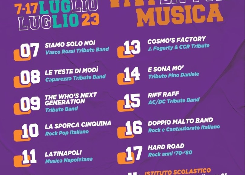 Si terrà dal 7 al 17 luglio il Chiesuola Summer Fest, la rassegna dedicata alle migliori tribute band di Latina e provincia, destinata e far vibrare l’anima musicale che alberga in ognuno di noi. Dal rock al pop al cantautorato italiano, con una incursione nella canzone classica e popolare napoletana, saranno undici giorni di grande musica durante i quali, grazie al talento degli artisti in cartellone, si potranno ascoltare dal vivo brani e autori che hanno fatto la storia della musica italiana e internazionale. Senza tralasciare lo spettacolo che questi gruppi sapranno proporre sul palco, con performance curate in ogni dettaglio, capaci di coinvolgere e travolgere.