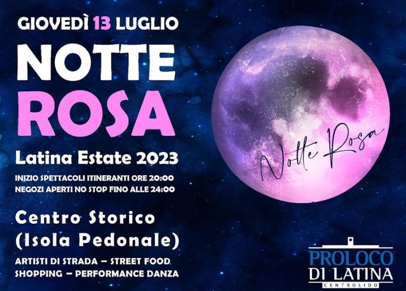 Giovedì, 13 luglio, “Notte rosa” in pieno centro a Latina, tra artisti di strada, spettacoli di danza e street food. Si tratta del primo evento messo in campo dall’assessorato al Turismo per la stagione estiva 2023. L’iniziativa, organizzata in collaborazione con l’associazione ProLoco di Latina Centro e Lido, ha lo scopo di rendere più attrattiva l’isola pedonale con momenti di intrattenimento per grandi e bambini e per rendere più piacevole lo shopping presso le attività commerciali che resteranno aperte, oltre il consueto orario, dalle 20 fino a mezzanotte.