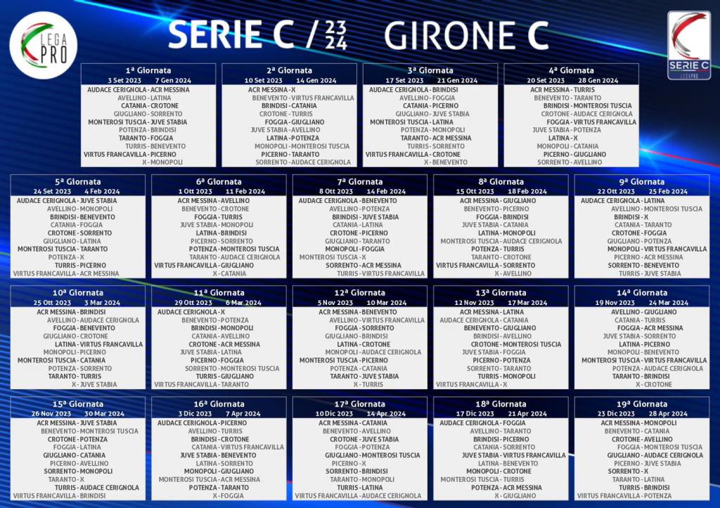 Ecco, nel dettaglio, le squadre che compongono il girone C di Lega Pro, stagione 2023/24: Audace Cerignola, Avellino, Benevento, Brindisi, Catania, Crotone, Foggia, Giugliano, Juve Stabia, Latina, Messina, Monopoli, Monterosi, Picerno, Potenza, Sorrento, Taranto, Turris, Virtus Francavilla e una X, che con ogni probabilità sarà la Casertana.
