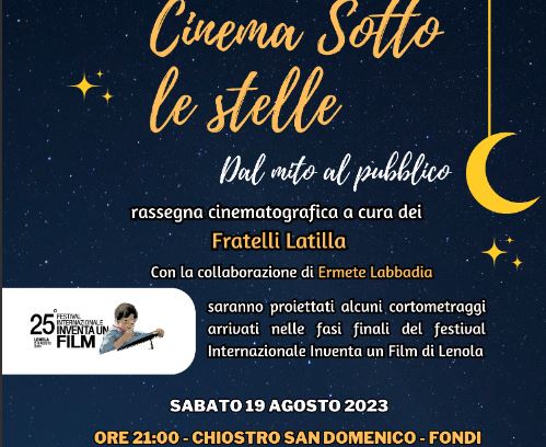 Grande attesa a Fondi per l’evento “Cinema Sotto le stelle – dal mito al pubblico”, rassegna cinematografica a cura dei Fratelli Latilla (registi e sceneggiatori) con la collaborazione di Ermete Labbadia (direttore artistico del Festival Inventa un Film).