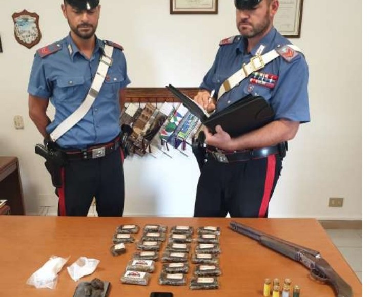 L’uomo all’esito di una perquisizione domiciliare, veniva trovato in possesso di1 fucile illegalmente detenuto e alterato 6 cartucce cal.12, kg. 2,100 di hashish (suddivisa in 21 pannetti), gr. 158 di cocaina e 1 bilancino di precisione, il tutto sottoposto a sequestro. L’arrestato, è stato sottoposto agli arresti domiciliari come disposto dall’A.G.