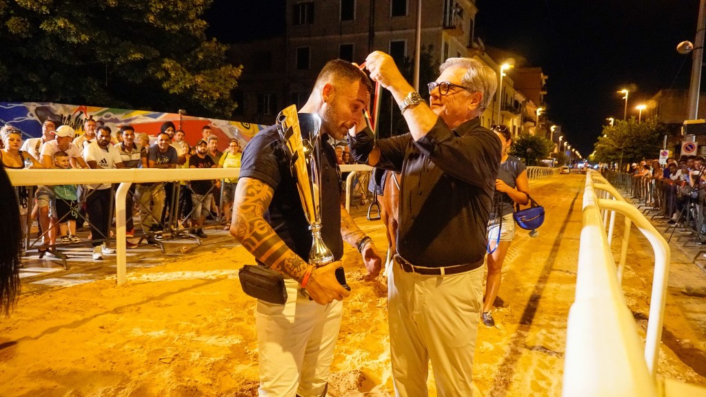 Infine è stato ricordato lo storico cavaliere e organizzatore del Palio, Valentino Siniscalchi, recentemente scomparso, con una targa consegnata alla vedova.