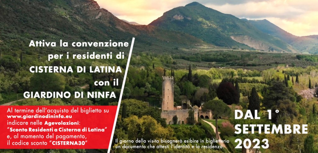 Da oggi, venerdì 1 settembre, i residenti nel comune di Cisterna di Latina possono prenotare la visita al Giardino di Ninfa usufruendo di uno sconto sul biglietto d’ingresso, mentre la visita annuale è gratuita per i gruppi organizzati dai centri anziani comunali. È infatti attivo il codice sconto ad uso esclusivo dei residenti di Cisterna di Latina sul portale www.giardinidininfa.eu che dà diritto ad una riduzione del 30% (pari a €4,72) sull’acquisto del biglietto d’ingresso.