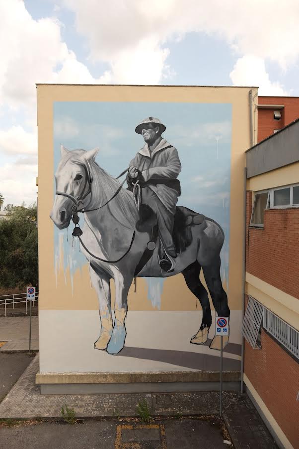 L’opera di Attorrep, invece, affronta la tematica dell’identità del luogo in occasione dei 90 anni della città di Latina. “Attraverso questo progetto – spiega lo street artist – si è cercato di valorizzare e riportare ai giorni nostri la tradizione dei butteri. Tra l’ottocento e la prima metà del novecento i butteri attraversavano le aree impervie e paludose per condurre buoi e cavalli al pascolo, controllando che nessuno di questi andasse perso nella folta macchia mediterranea. I cowboy italiani si chiamano butteri. Una tradizione che risale ai tempi degli etruschi quando i butoros controllavano il bestiame nel centro Italia nella regione dell’Agro pontino, la quale rimase selvaggia e inospitale fino ai tempi della bonifica che trasformò la palude in una fertile pianura modificando non solo il paesaggio, ma anche alcune figure caratteristiche di questo territorio. Le mandrie vivevano infatti libere in un grande territorio finendo così per disperdersi, ed era compito del buttero quello di sorvegliarle, radunarle e spostarle da un pascolo all’altro nella transumanza. Quando alcuni capi di bestiame mancavano all’appello – conclude Attorepp – bisognava infatti andarli a cercare e così il buttero spesso si trovava lontano dalla famiglia a sopravvivere nelle intemperie mangiando pasti frugali all’aria aperta. Un vita in simbiosi con il cavallo, fedele compagno di vita con il quale si veniva a creare uno speciale rapporto”.