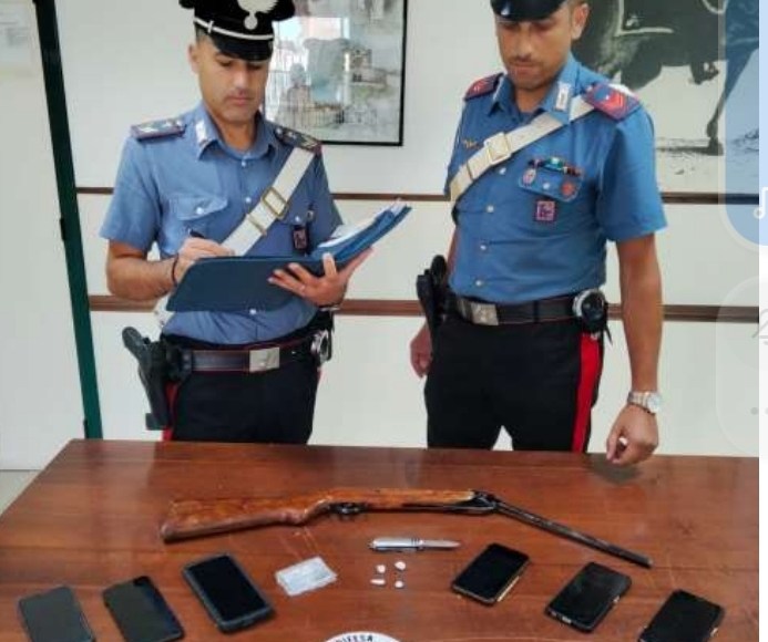 e la conseguente perquisizione, ha permesso di procedere al rinvenimento ed al successivo sequestro della carabina ad aria compressa, di un coltello multiuso, di diversi proiettili in metallo e di due grammi di sostanza stupefacente del tipo cocaina.
