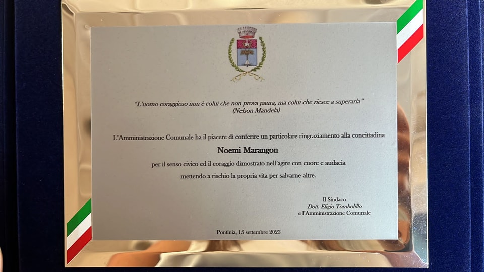La città di Pontinia, a quasi due mesi da quel giorno, ha voluto premiare Noemi Marangon per il coraggio mostrato e così l’Amministrazione le ha reso omaggio in aula consiliare, consegnandole una targa.