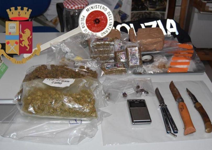 Alla luce delle risultanze investigative, con l’ausilio della Squadra Volante e la collaborazione del Nucleo Cinofili della Guardia di Finanza di Formia, i poliziotti hanno proceduto alla perquisizione domiciliare. La ricerca si è conclusa positivamente, poiché, abilmente celata in scatole di alimenti ed in altri insospettabili effetti personali, sono stati rinvenuti tre etti di marjuana e oltre un chilo di hashish, nonché un bilancino ed altro materiale per il frazionamento delle dosi, alcune già confezionate e pronte per essere immesse sul mercato.