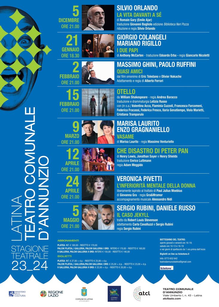 Un cartellone che saprà appassionare e coinvolgere il pubblico in serate sempre sorprendenti a cui si aggiungono i due eventi di apertura con “Quel che provo dir non so” con Pierpaolo Spollon l’11 novembre ore 21 e il concerto di Nino D’Angelo il 7 dicembre ore 21, grazie alla collaborazione tra il Comune di Latina e ATCL, circuito multidisciplinare del Lazio sostenuto da MIC-Ministero della Cultura e Regione Lazio.
