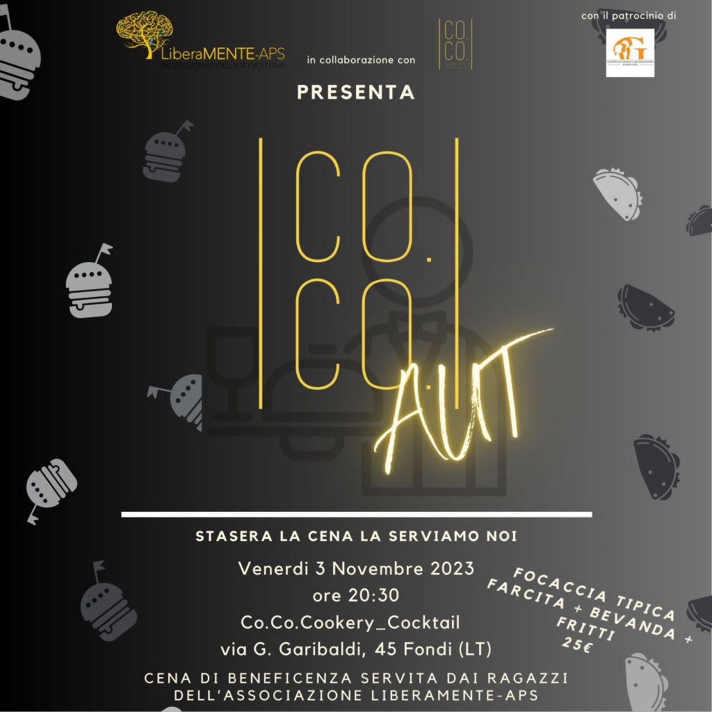 Per venerdì 3 novembre l’associazione LiberaMente- APS ha organizzato presso il co.co_cookery_cocktail di Fondi una serata davvero speciale. Alcuni ragazzi dell’associazione si trasformeranno in “Camerieri per una sera” diventando membri dello staff del locale e servendo in maniera super professionale tutti gli ospiti della serata. L’evento è già sold-out.
