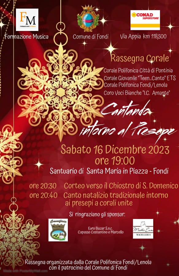 Si esibiranno la Corale Polifonica Città di Pontinia, la Corale giovanile “Teen…Canto” ETS, la Corale Polifonica Fondi/Lenola e il coro delle voci bianche dell’Istituto comprensivo Amante di Fondi.