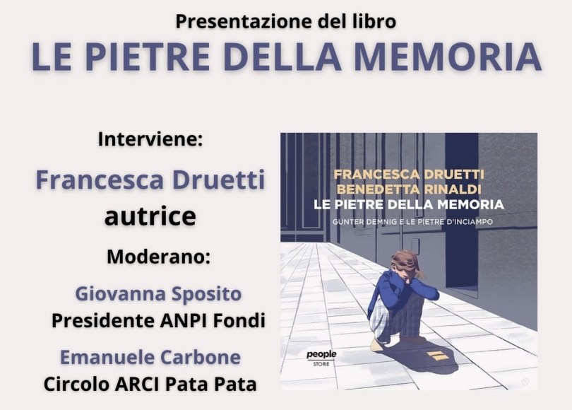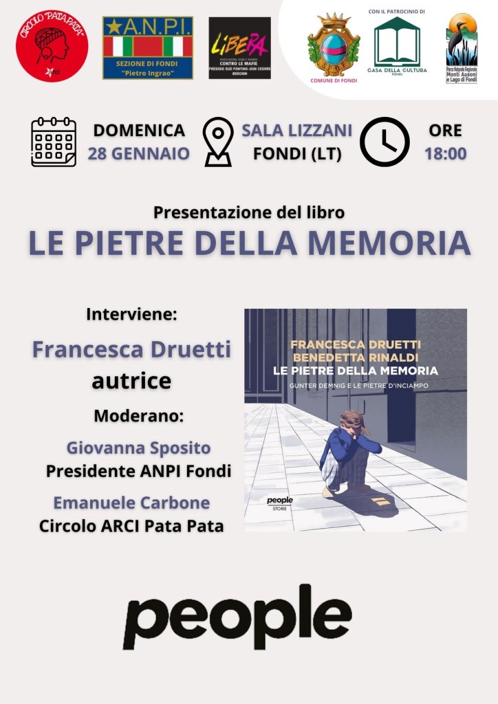 L’iniziativa, promossa nell’ambito del Giorno della Memoria, è organizzata dalla sezione ANPI di Fondi “Pietro Ingrao”, dal circolo ARCI “Pata Pata” e dal presidio Libera Sud Pontino “Don Cesare Boschin” con il patrocinio del Comune di Fondi, dell’Ente Parco Naturale Regionale Monti Ausoni e Lago di Fondi e della Casa della Cultura. Insieme all’autrice Francesca Druetti, storica ed attivista, modereranno l’evento la presidente dell’ANPI di Fondi Giovanna Sposito e l’esponente del circolo ARCI Emanuele Carbone.