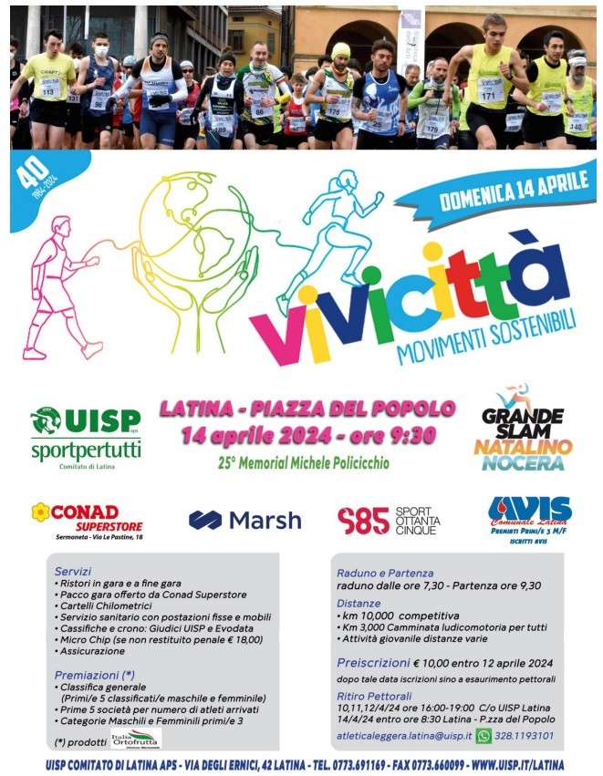 Subito dopo lo start sul rettilineo di Piazza del Popolo si misureranno in corse su diverse distanze decine di alunni delle scuole cittadine. Al gruppo scuola più numeroso sarà assegnato uno speciale riconoscimento che quest’anno acquista ancor più rilevanza: si tratta del 25esimo “Memorial Michele Policicchio”, in ricordo di un grande uomo di sport, tra i fondatori dell’Uisp di Latina, scomparso prematuramente ma la cui opera rimane nel cuore di tutti coloro che hanno avuto la fortuna di collaborare con lui. La partecipazione delle scuole si inserisce nel più ampio contesto del progetto per l’avviamento all’atletica giovanile rivolto a ragazzi dai 5 ai 14 anni, intrapreso due anni fa da Massimo Siliani e Antonio Sorrenti con il Team Atletica Uisp, la società di riferimento per l’attività junior e master sul territorio. I giovani atleti saranno impegnati in percorsi ludico motori e mini gare di velocità, ideati per promuovere attività motoria all’aperto, senza alcuna competizione. Come vuole la tradizione di Vivicittà, inoltre, ampio risalto sarà dato alla camminata di 3 chilometri per le vie del centro, con start subito dopo la partenza dei podisti: l’iscrizione sarà gratuita per i partecipanti al progetto “Attivati”, promosso dall’UISP e finanziato da Sport e Salute S.p.A., coordinato sul territorio provinciale dalla professoressa Elisa Morazzano e dall’istruttrice Karina Liczmonik.